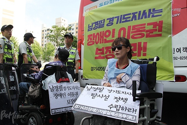 경기 지역 장애인들이 남경필 경기도지사가 장애인 생존권 보장을 위한 면담에 나설 것을 촉구하며 경기 광역버스를 점거했다.