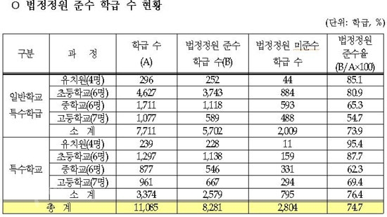 또한 교원 부족 때문에 특수학급의 법정정원 준수율도 74.7%에 그친 것으로 나타났다. 일반학교의 특수학급 법정정원 준수율은 73.9%, 특수학교의 법정정원 준수율은 76.4%로 법정정원을 지키지 않는 학급 수는 2,804개에 이르렀다.