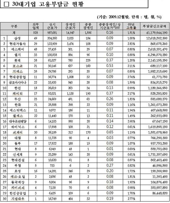 국회 환경노동위원회 신영수 의원(한나라당)의 국정감사 자료를 보면 30대 그룹 중 장애인 의무고용률 2%를 준수한 곳은 현대자동차, 포스코, 현대중공업, 케이티, 대우조선해양, 지엠대우 등 6곳에 불과했다. 삼성, 에스케이, 엘지, 지에스, 현대건설, 신세계 등 12곳은 1%에도 미치지 못했다.